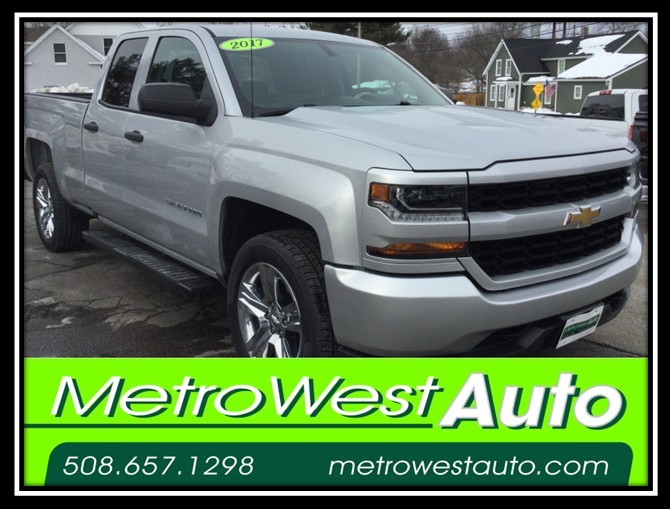 LOW MILES. BIG ATTITUDE. BUILT CHEVY TOUGH. GET READY TO STAND OUT IN THIS LOW-MILEAGE 2017 CHEVROLET SILVERADO 1500 4WD DOUBLE CAB CUSTOM — A TRUCK THAT BRINGS BOLD LOOKS, PROVEN POWER, AND EVERYDAY VERSATILITY TOGETHER IN ONE RUGGED PACKAGE. LOW MILEAGE – HARD TO FIND, EASY TO LOVE 4WD FOR YEAR-ROUND TRACTION AND CONTROL DOUBLE CAB WITH ROOM FOR PASSENGERS OR GEAR LEGENDARY CHEVROLET STRENGTH AND DEPENDABILITY WHETHER YOU NEED A DEPENDABLE WORK TRUCK OR A SHARP-LOOKING DAILY DRIVER, THIS SILVERADO CHECKS EVERY BOX. A MUST SEE! NO ACCIDENTS, CLEAN 1-OWNER CARFAX!!! METRO WEST AUTO IS LOCATED ON RTE. 126, 2 MILES EAST OF 495. 478 HARTFORD AVE. BELLINGHAM, MA 508-657-1298 WE PRIDE OURSELVES ON SELLING NICE, CLEAN CARS FULLY SERVICED AND WARRANTIED. WWW.METROWESTAUTO.COM